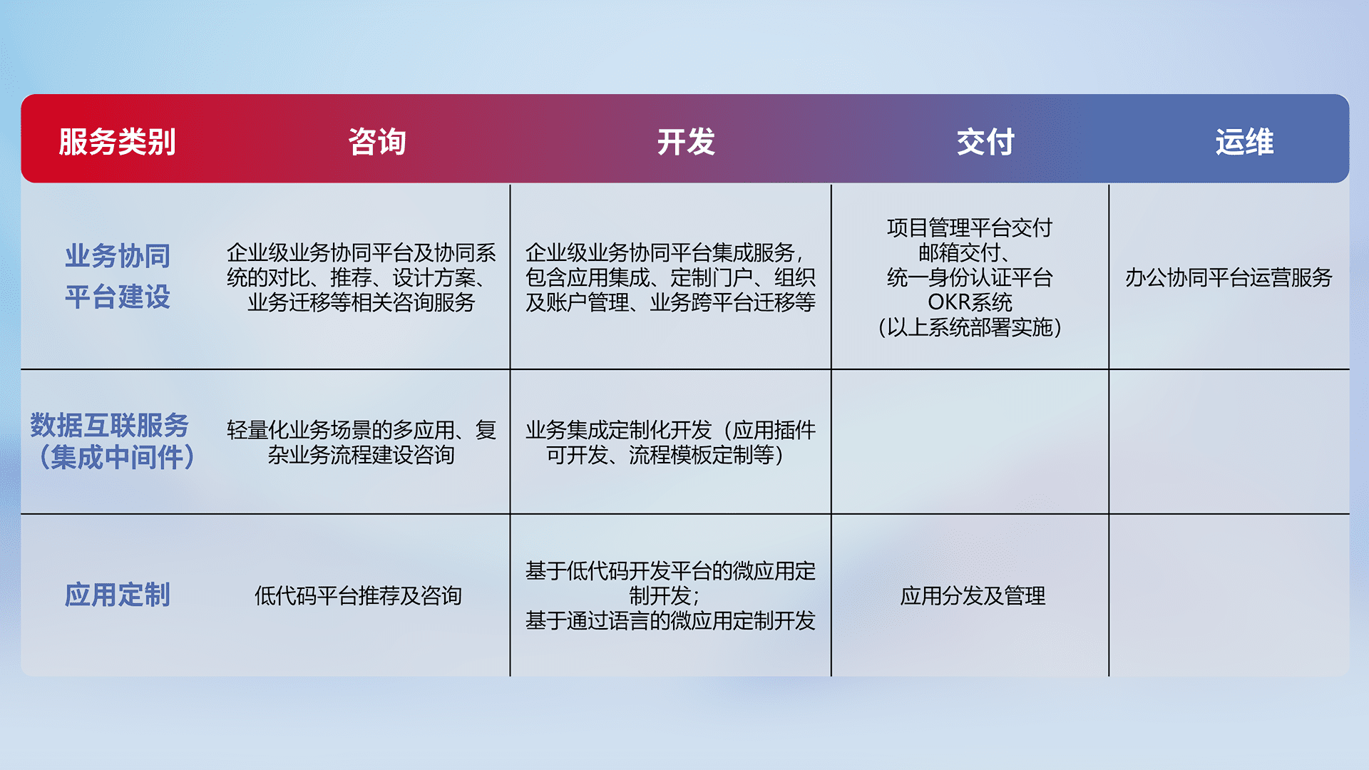针对钉钉、、、企微、、、IDaas等平台级产品提供产品的规划、、、方案、、、、交付、、、定制化开发等服务,,,实现如统一协同办公、、、、智能客户服务、、、混合会议管理、、、、智能数据查询、、等业务场景,,实现数字化转型。。。